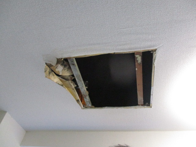 点検口のボード部分は水分を吸って崩れてしまい、現在は金属の枠のみが虚しく残っている状態です。