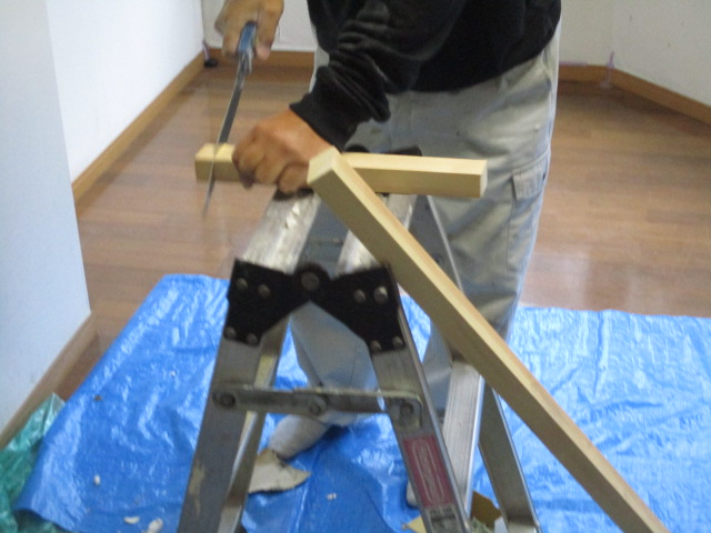 新しい下地となる垂木材を正確な寸法でカットします。これが天井の重みを支える背骨となります。