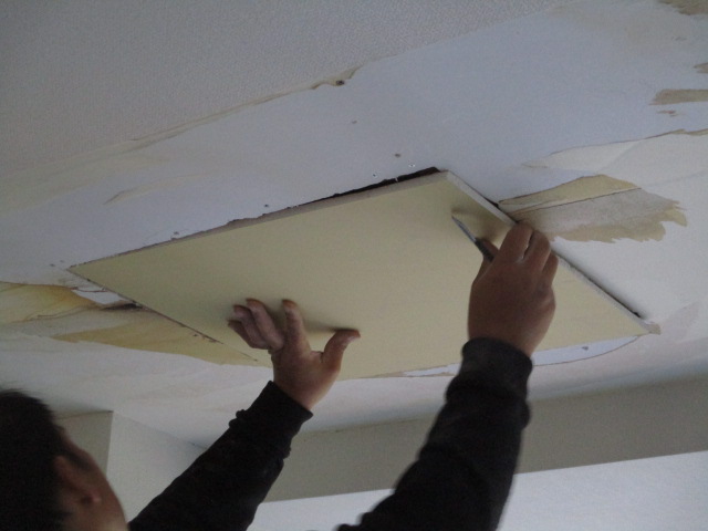 職人は、まず傷んだボード部分を大きく四角く切り取り、健康な下地が露出するまで範囲を広げていきます。その後、天井裏に新しい垂木材を渡し、既存の構造体にしっかりと固定いたします。この垂木が新しいボードを支える受け材となります。キレイに開口し直した開口部に新規ボードを収めていきます。数ミリの隙間もないように精密にカットされた新しい石膏ボードを、先ほど設置した垂木にビスで強固に固定していきます。この工程によって、水漏れ前よりも強度の高い、しっかりとした天井の土台が復活いたしました。