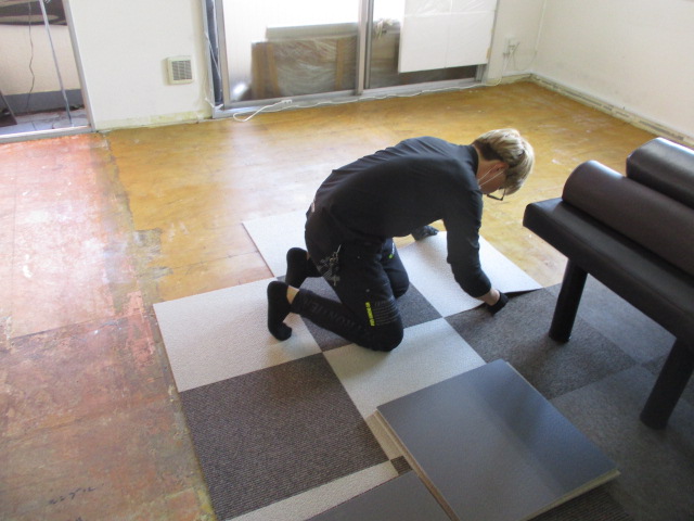 新しいタイルカーペットを基準線に合わせて正確に並べていきます。隙間のない密着が重要です。