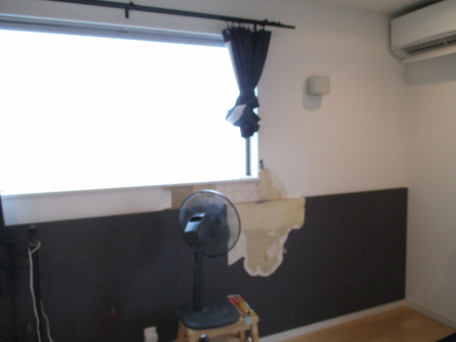 幸いなことに、心配していたふかし壁もボードがボロボロでカビだらけという事もなかったので、最小限の補修で対応することが可能でした。水分はすでに乾燥しており、ボードの強度も維持されていたため、パテ埋めでの補修で済みました。数回にわたって丁寧にパテを塗り重ね、表面の凹凸を完全に平滑に整えることで、新しいクロスが吸い付くように密着する最高の下地を再構築いたしました。もしここでボードの腐食を見逃してしまうと、新しいクロスを張った後に再びカビが表面に浮き出てきてしまいます。見えない部分の健康状態を正確に見極めることこそ、熟練の職人の使命です。