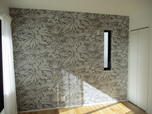 かなり目立つ南国風のアクセントクロスです。色鮮やかな葉のデザインが壁一面に広がっています。