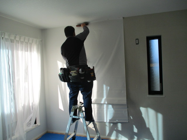 既存のアクセントクロスを慎重に剥がしていきます。下地の石膏ボードを傷つけない丁寧な手仕事です。