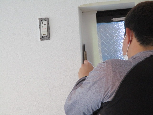アクセントクロスを剥がし、新しいクロスを貼っていきます。今回の現場で特に技術が求められたのが、窓周りの処理です。最近はやりの窓の巻き込み部分についても、丁寧に処理をしていきます。巻き込み仕上げとは、窓枠の木材を使わずに、壁紙を窓の開口部の角に沿って内側まで張り込む手法のことです。これにより、見た目がスッキリとしてモダンな印象になりますが、角の部分でクロスが浮きやすく、裁断の精度がそのまま仕上がりの美しさに直結します。熟練のスタッフは、専用のカッターを使い分け、数ミリの狂いもなくクロスの端を整えていきました。また、スイッチやコンセントのプレートも一旦取り外し、クロスの裏側で完璧に処理してから再度設置することで、細部まで妥協のない仕上がりを追求いたしました。