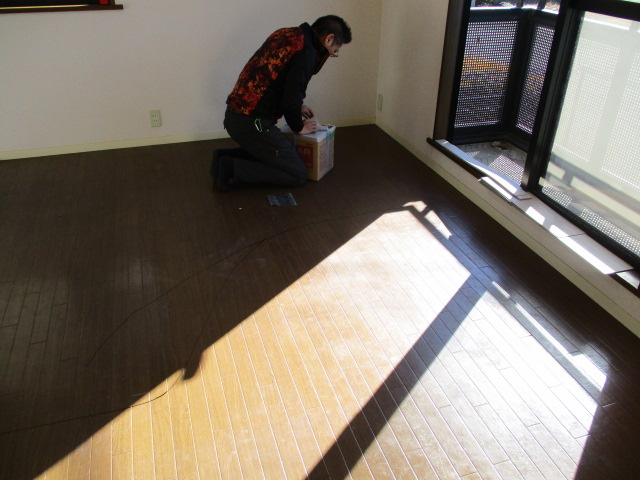 上貼り工法が可能であると判断した後はお部屋の隅々まで丁寧に掃除機をかけフローリングの表面に残っているわずかなホコリや油分を完全に拭き取ってから新しい床材を張り付けるための準備に入ります。