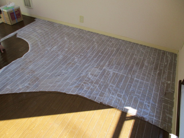 お部屋の寸法に合わせてあらかじめ正確にカットしておいたフロアタイルを隙間なく丁寧に張り詰めていきます。