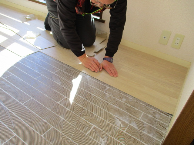 適切なオープンタイムを経て接着剤が最高の状態になったことを確認したらいよいよ新しいフロアタイルを一枚ずつ床に張り付けていく工程に入ります。