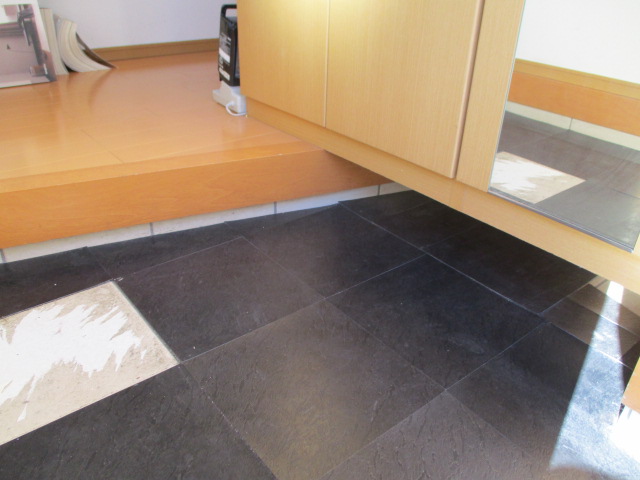 適切なオープンタイムを経て最高の接着状態になった床に対して新たなフロアタイルを一枚ずつズレのないように隙間なく張り詰めていきます。玄関の框と呼ばれる段差の部分や壁際などの複雑な形状に合わせてカッターで精密な切り込みを入れピッタリと収まるように加工を施します。このようにただ張るだけではなく古い糊の除去からパテ埋めそしてオープンタイムの徹底した管理など数多くの重要な工程が存在するため居室のように面積が広くない玄関の土間であっても完璧に仕上げるためにはそれなりに長いお時間を頂戴することになります。