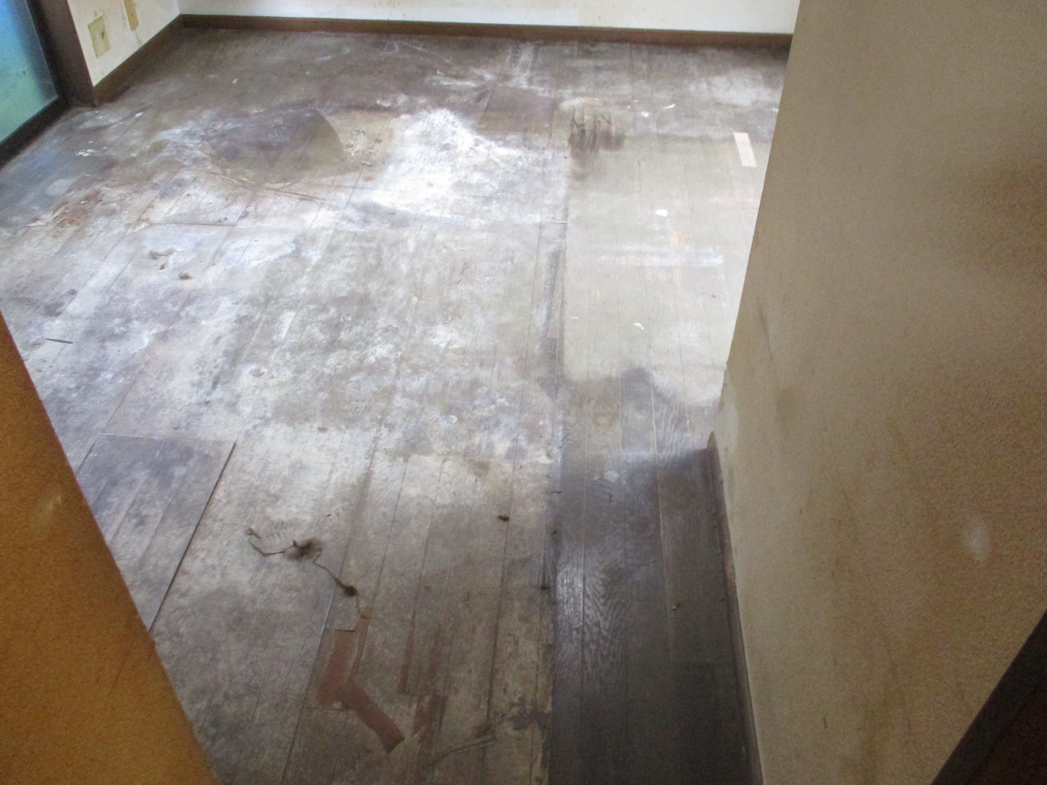 写真をご覧いただくと、古い床の上に新しい綺麗な木の板が隙間なく敷き詰められているのがお分かりいただけるかと思います。これが捨て貼りの工程です。
