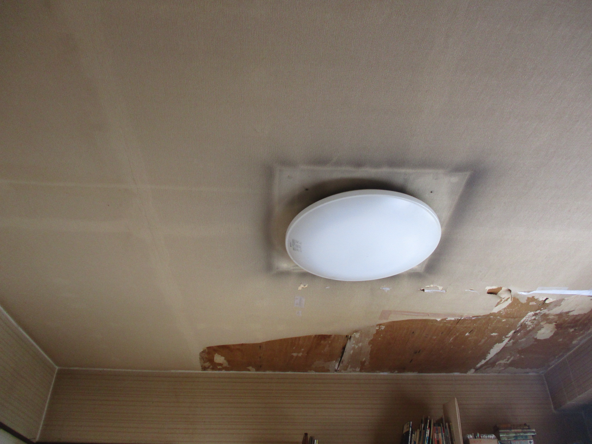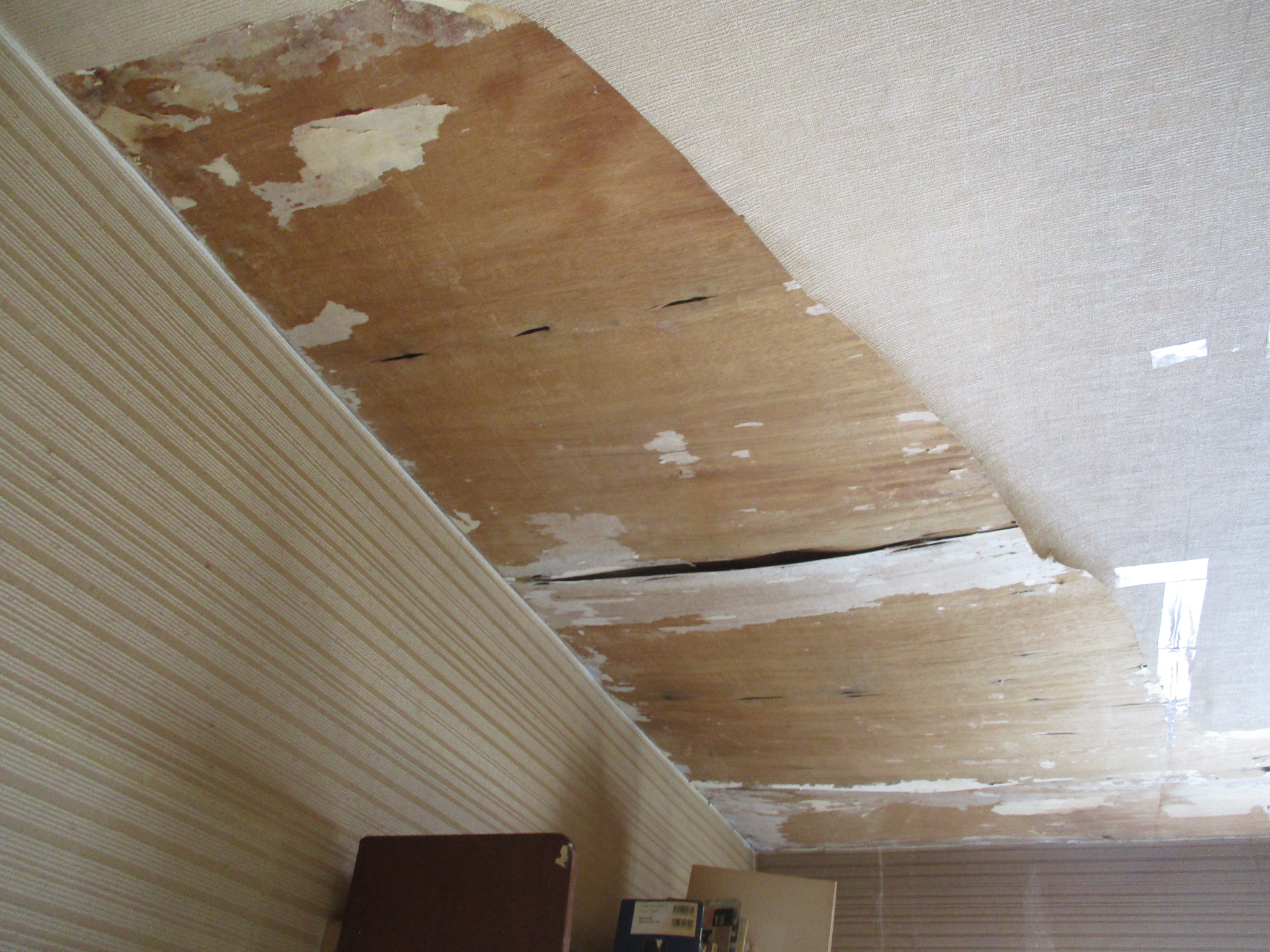 壁紙を剥がすと天井の下地材として使用されていたベニヤ板が姿を現しました。しかしそのベニヤ板は上階から降り注いだ大量の水分を吸い込んで激しくたるみ、一部はすでにめくれ上がって剥がれ落ちそうになっている非常に危険な状態でした。