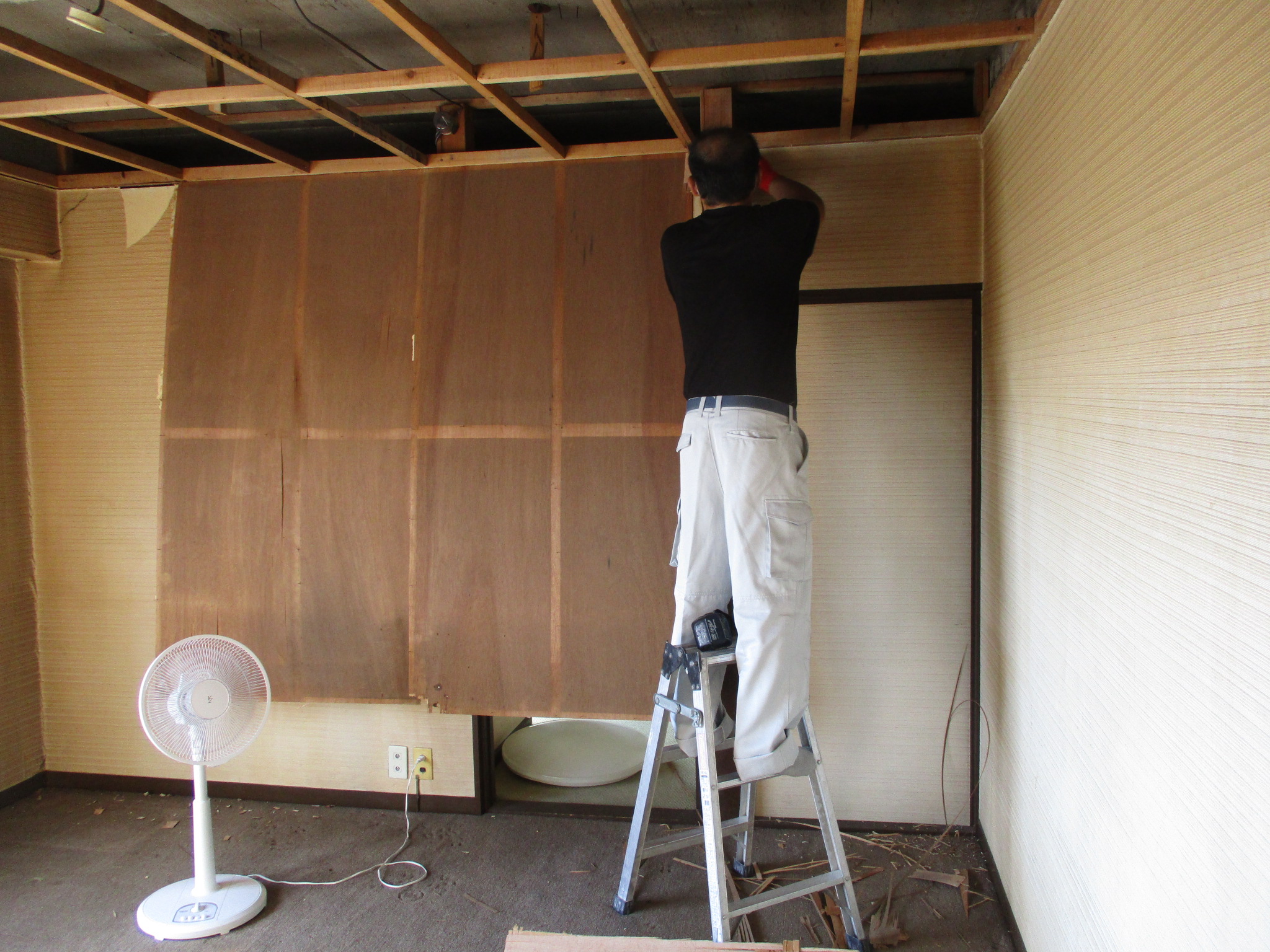 安全が確認された頑丈な骨組みに向かって、新しい天井の下地材となる石膏ボードを一枚ずつ丁寧に張り合わせていきます。