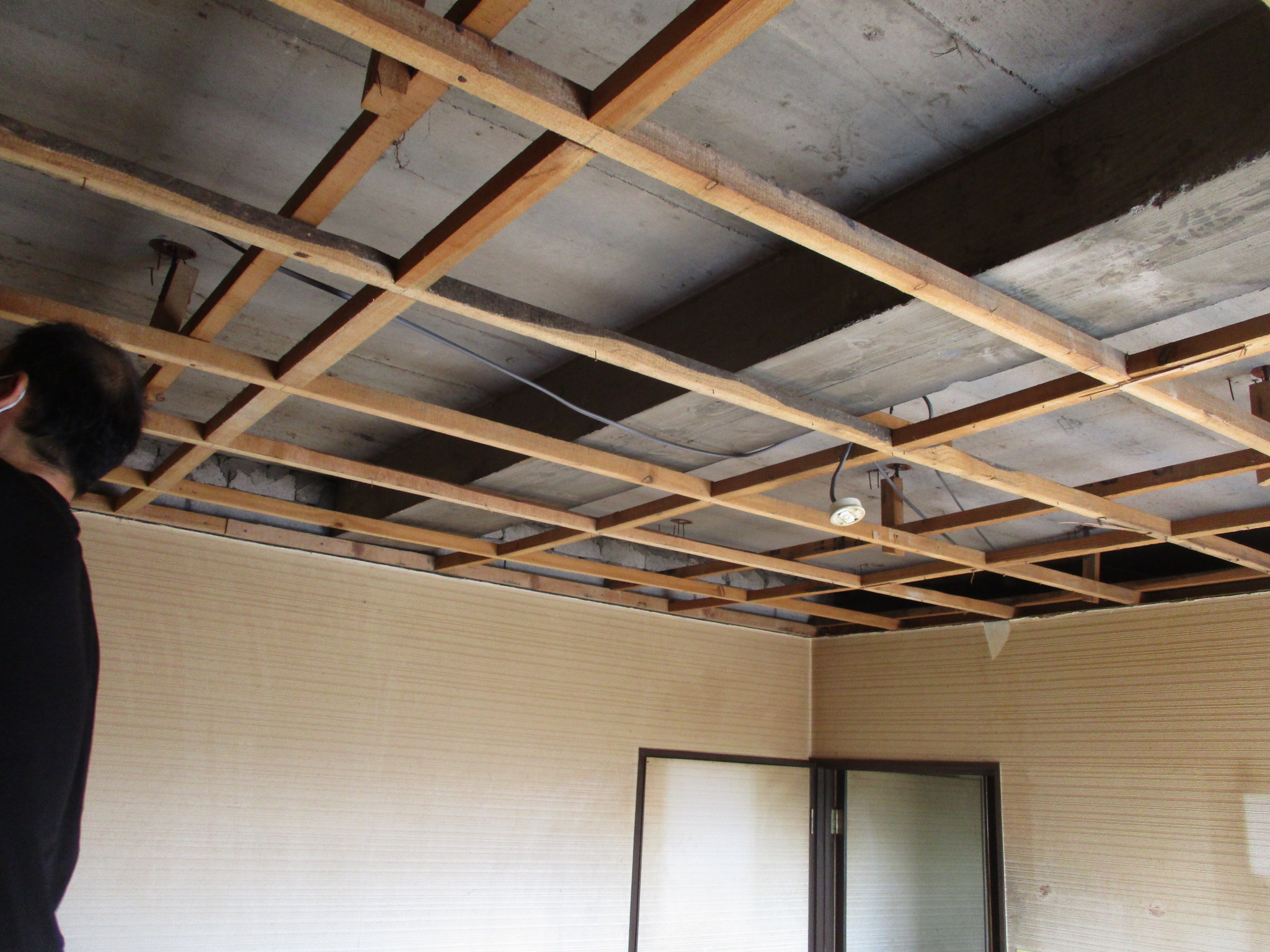 天井のベニヤ板をすべて剥がし落とすと、天井裏のコンクリートとそこから吊り下げられている木材の骨組みが完全に露出しました。この状態でプロの職人が懐中電灯を照らし、木材を直接触って強度や水分の残り具合を一本一本入念に点検していきます。