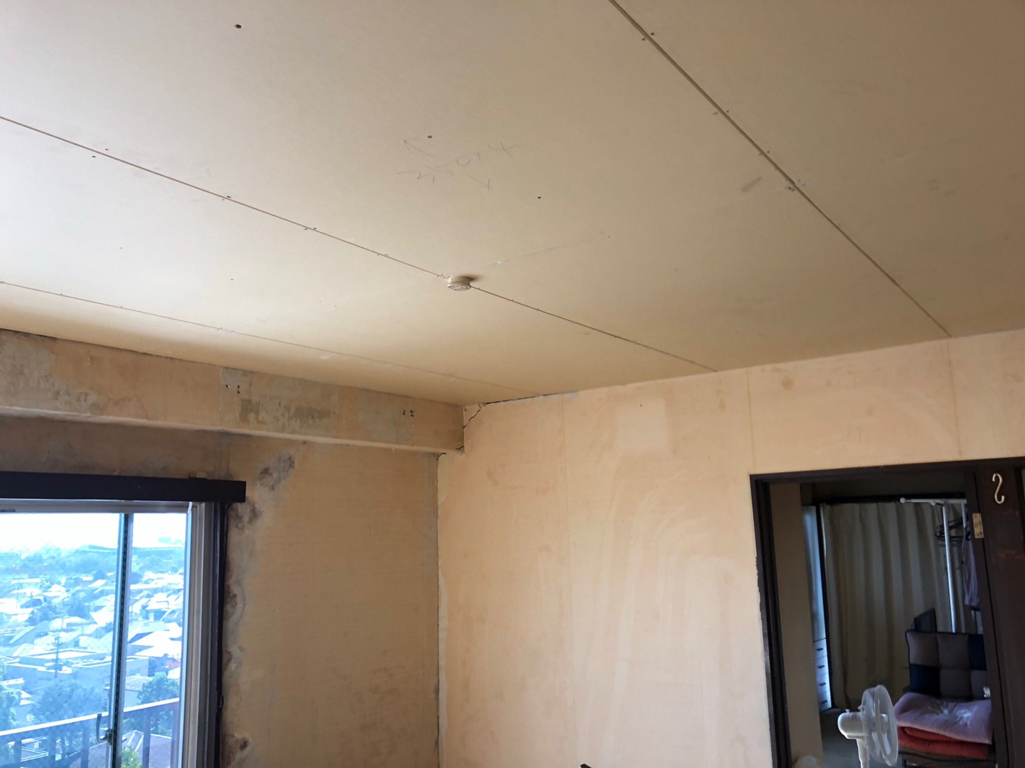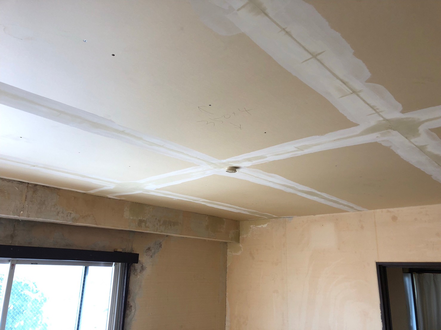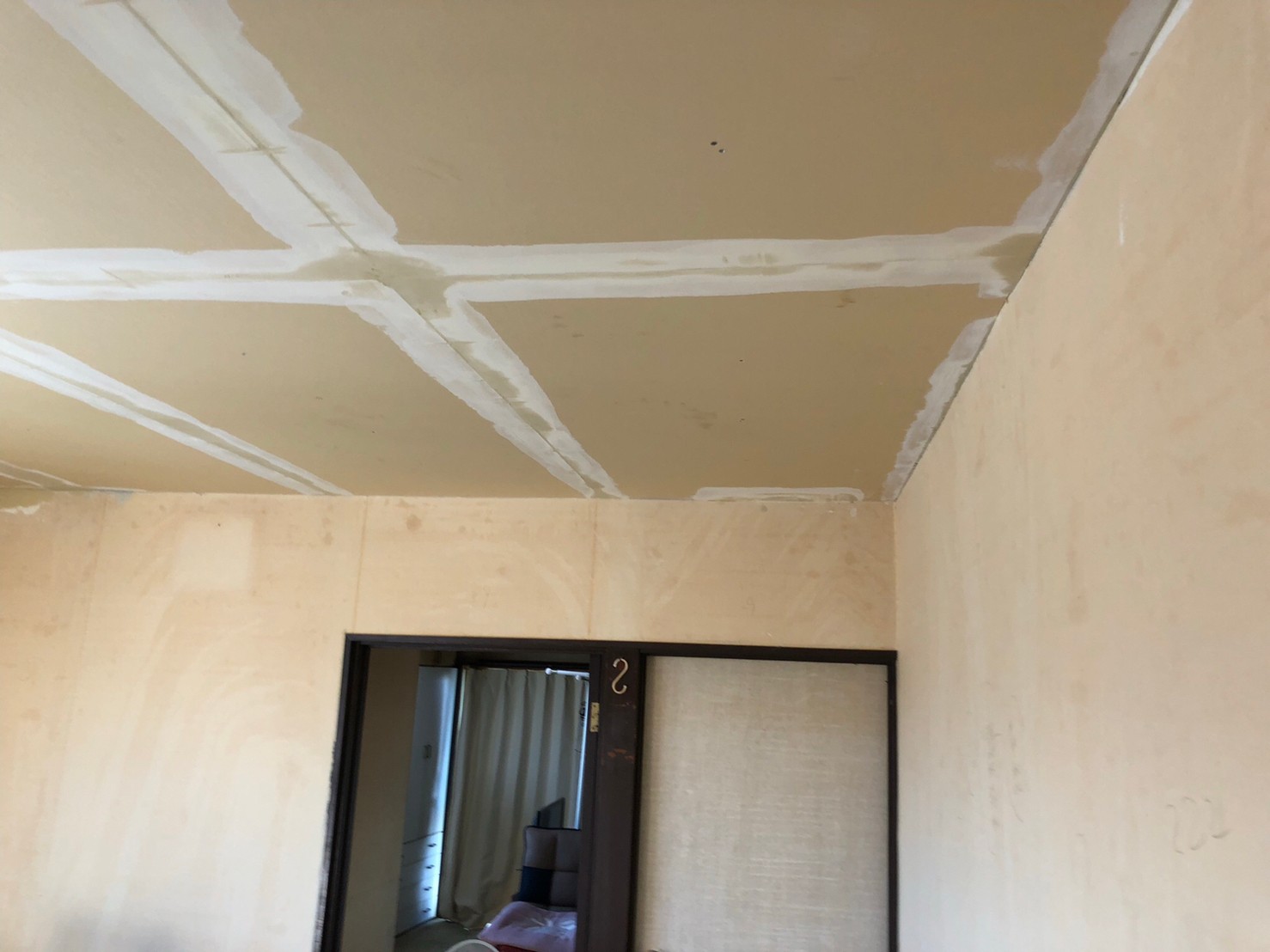 石膏ボードは耐火性や遮音性に優れた現代の住宅には欠かせない建材です。これを天井全面に隙間なく張り巡らせることで、以前のベニヤ板よりもさらに頑丈で平らな新しい天井の土台が完成いたしました。