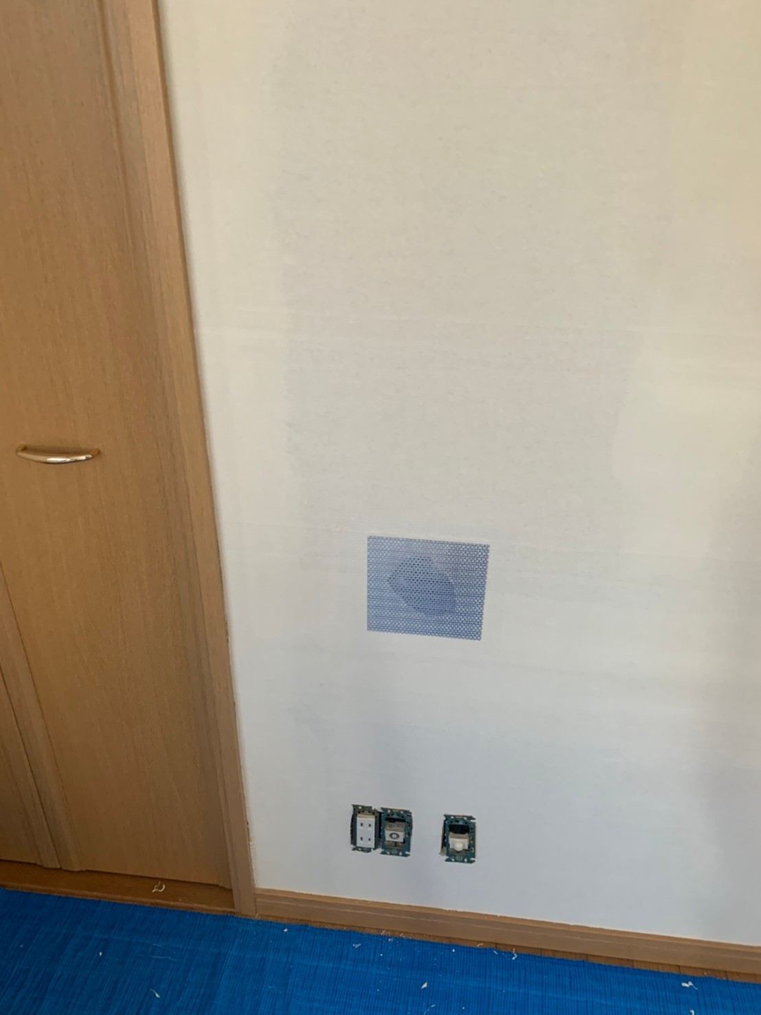 壁全体の下地を大まかに整えた後、いよいよ今回のメインとなる壁の穴を塞ぐ工程に入ります。ここで大きな役割を果たすのが、リペアパッチと呼ばれる壁穴専用の特殊な補修部材です。