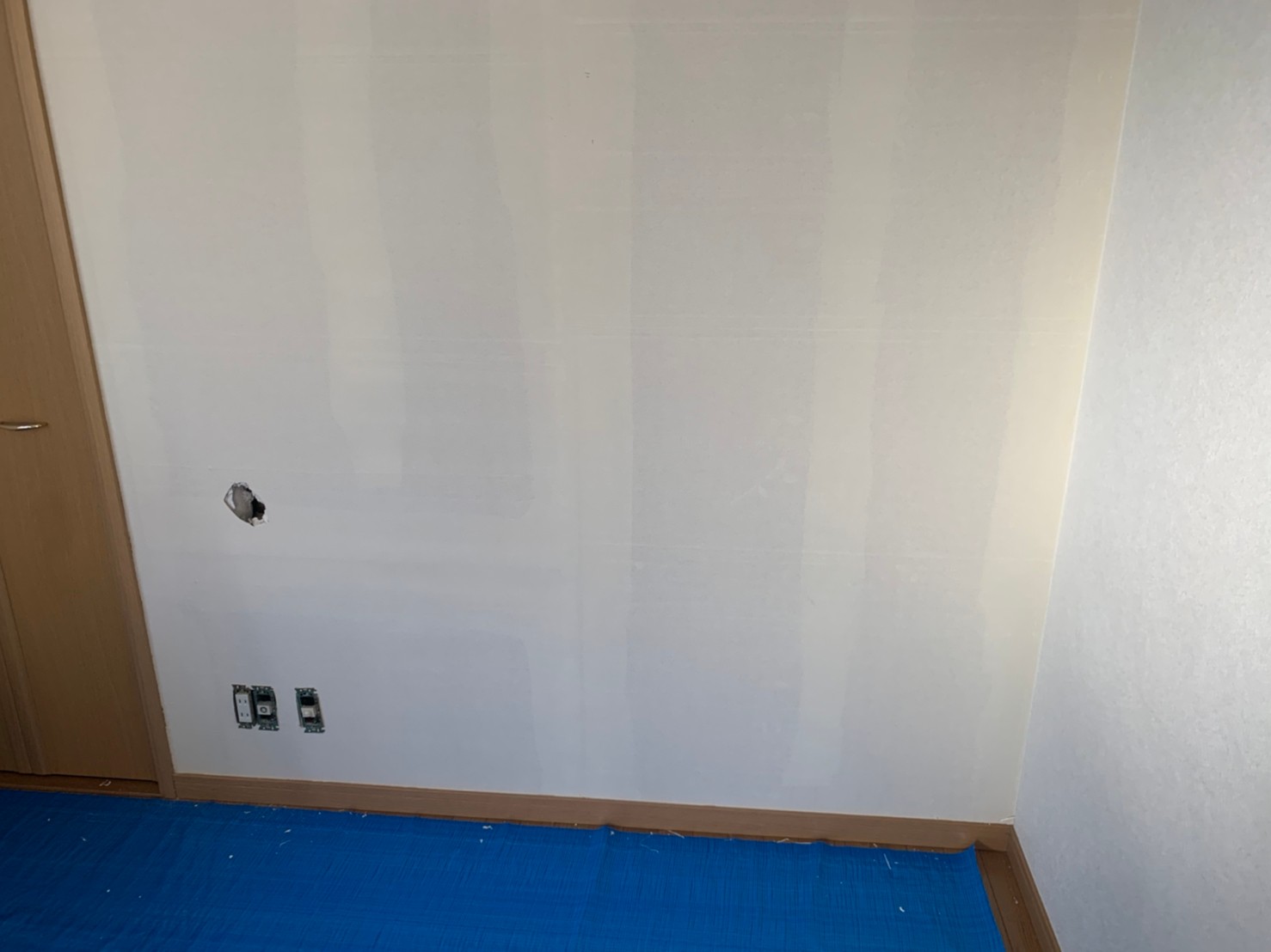 それでは実際の施工の様子を順番に詳しく見ていきましょう。まずは今回補修のご依頼をいただいたお部屋の壁の、施工前の状態を確認いたします。今回の施工内容は、壁に穴が複数箇所開いてしまっている状態であり、切り貼り補修ではなくクロスを一面張り替えるという工事になります。