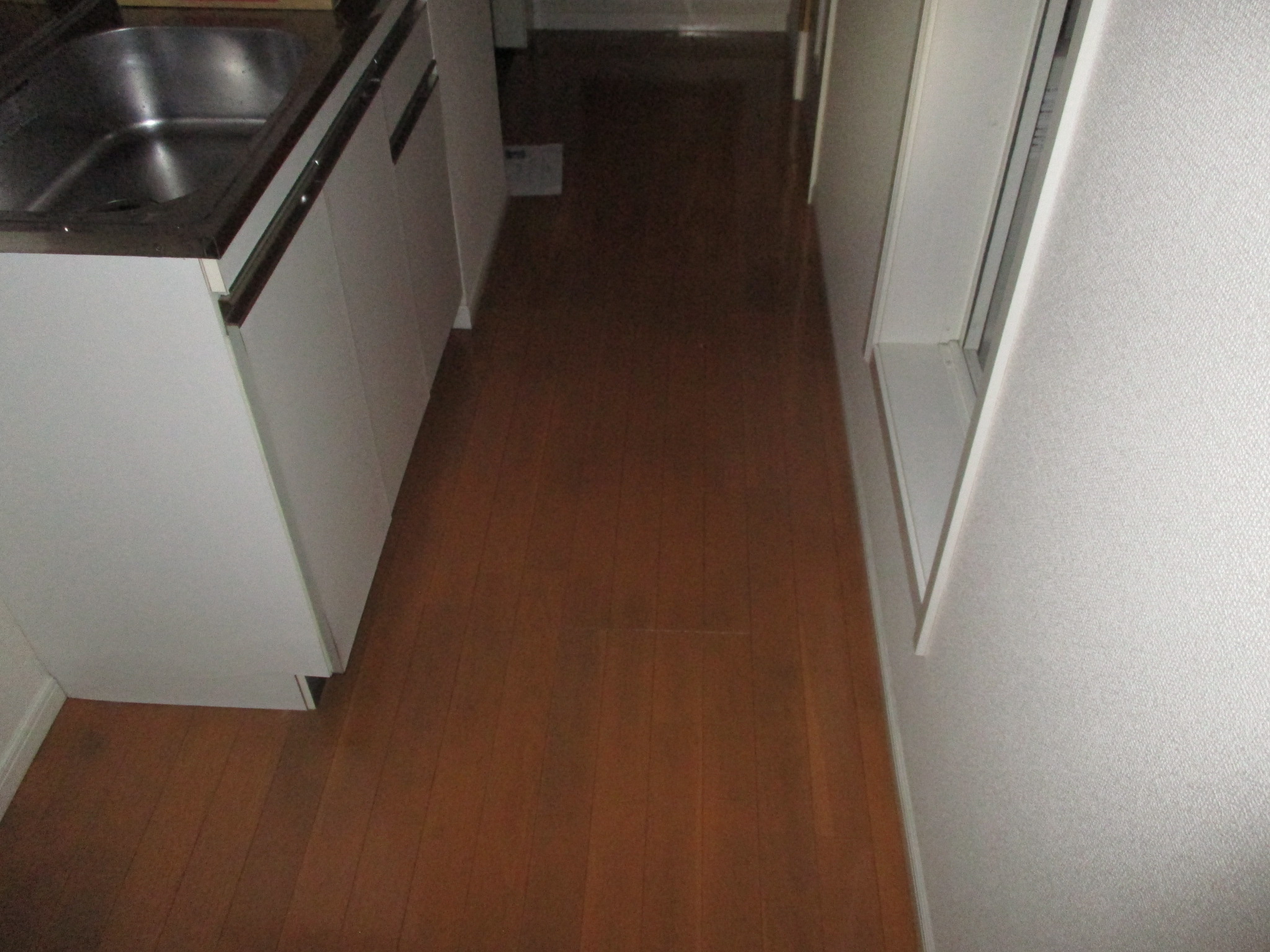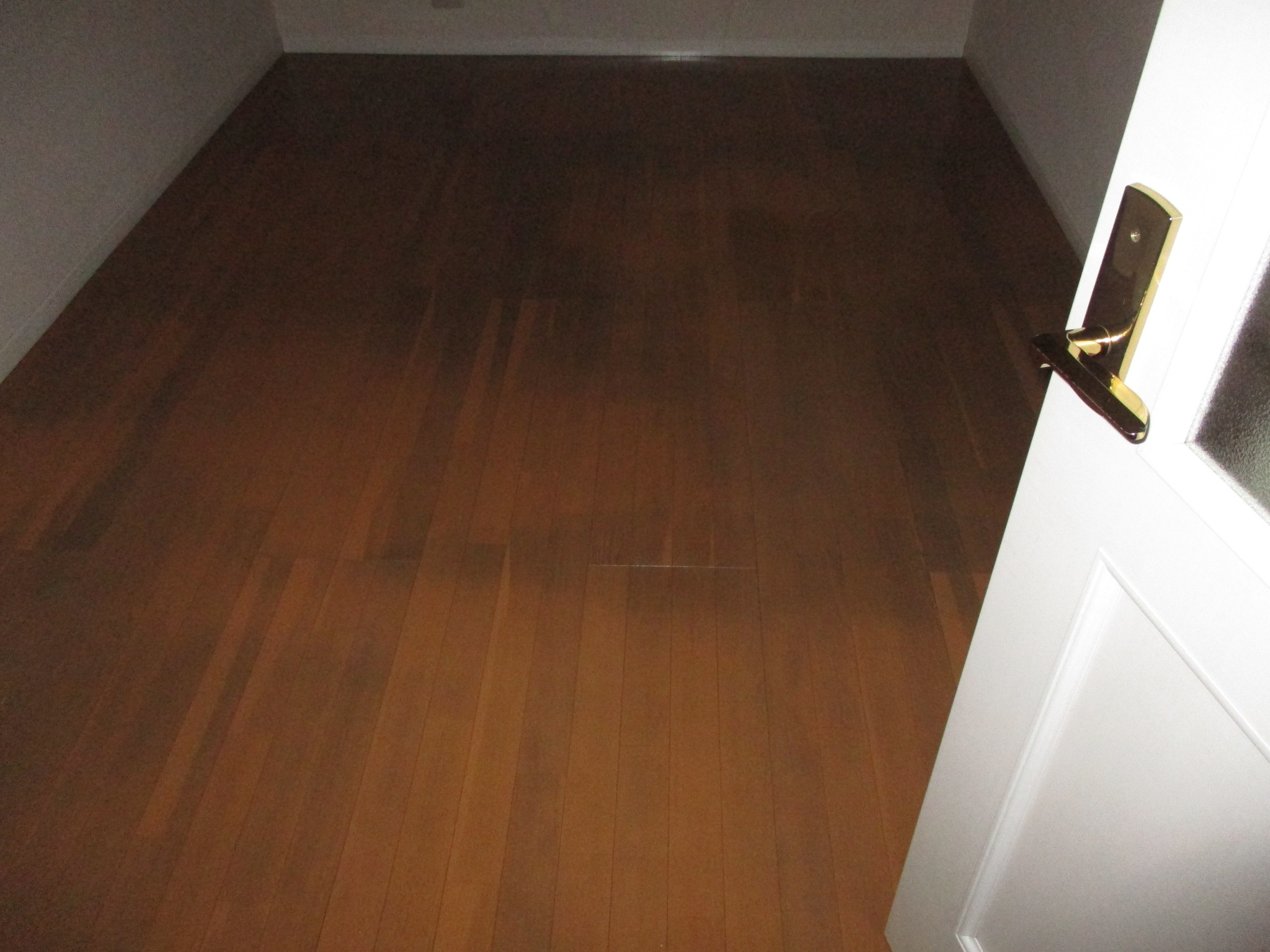 全体的にフローリングの表面が変色しており、日常的な生活でついた細かい傷や、窓際の結露によると思われる黒ずみ汚れなどが所々に目立っています。賃貸物件の場合、専門業者によるハウスクリーニングを行っても、床材そのものに染み込んでしまった汚れや表面のコーティングの剥がれまでは修復することができません。新しい入居者様に気持ちよく生活していただくためには、床の美観を回復させる抜本的な対策が必要な状態でした。