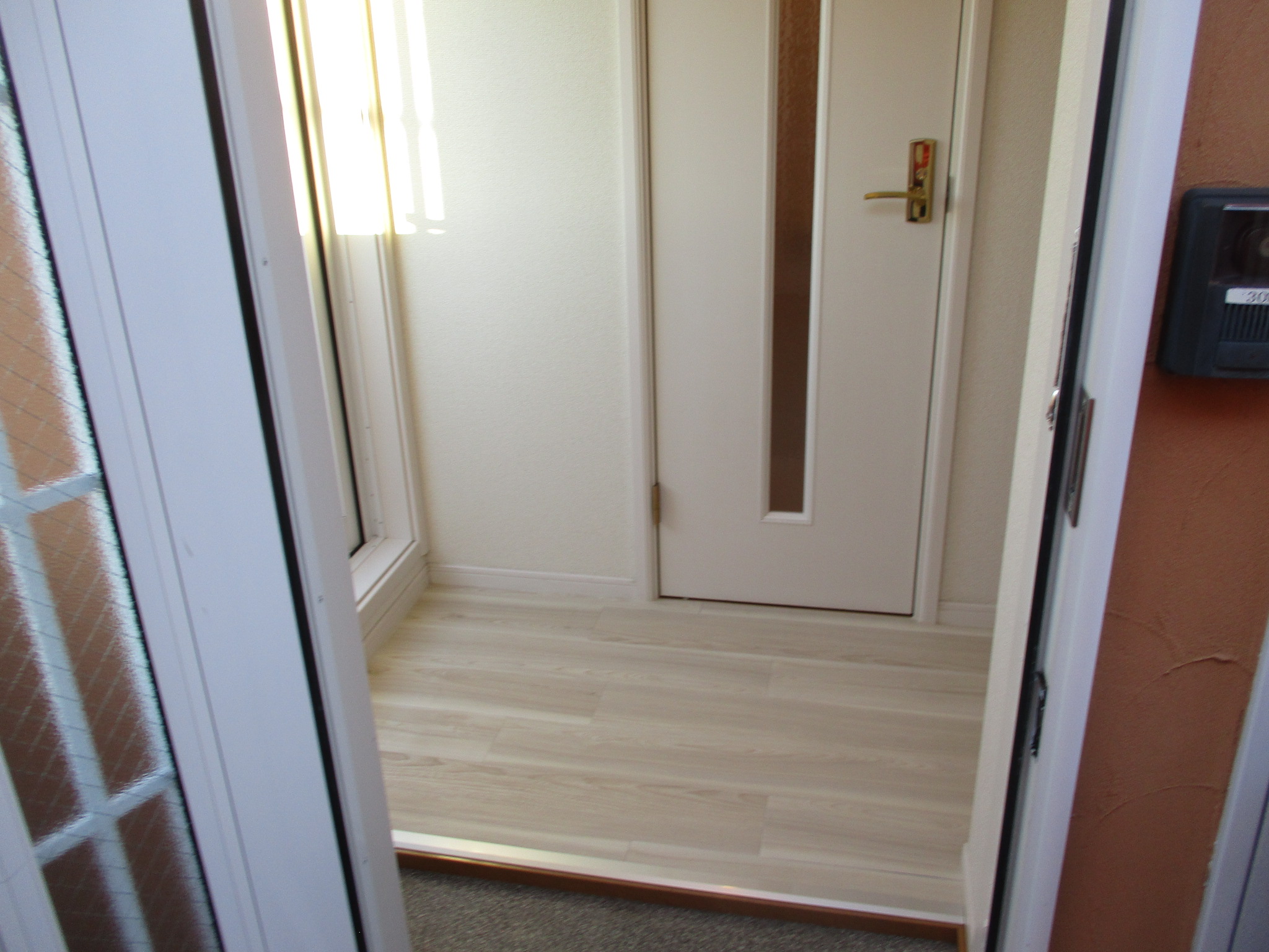 今回の施工において、プロとして細心の注意を払ったポイントがあります。それは玄関の上がり框と呼ばれる段差部分の仕上げです。上貼り施工では既存の床の上に厚さ数ミリメートルのフロアタイルを重ねるため、どうしても端の部分の断面がむき出しになってしまいます。そこを美しく保護するために、専用の見切り材をしっかりと設置いたしました。お部屋の間取りによっては、廊下やトイレの出入り口などにもこの見切り材が必要となる場合があります。