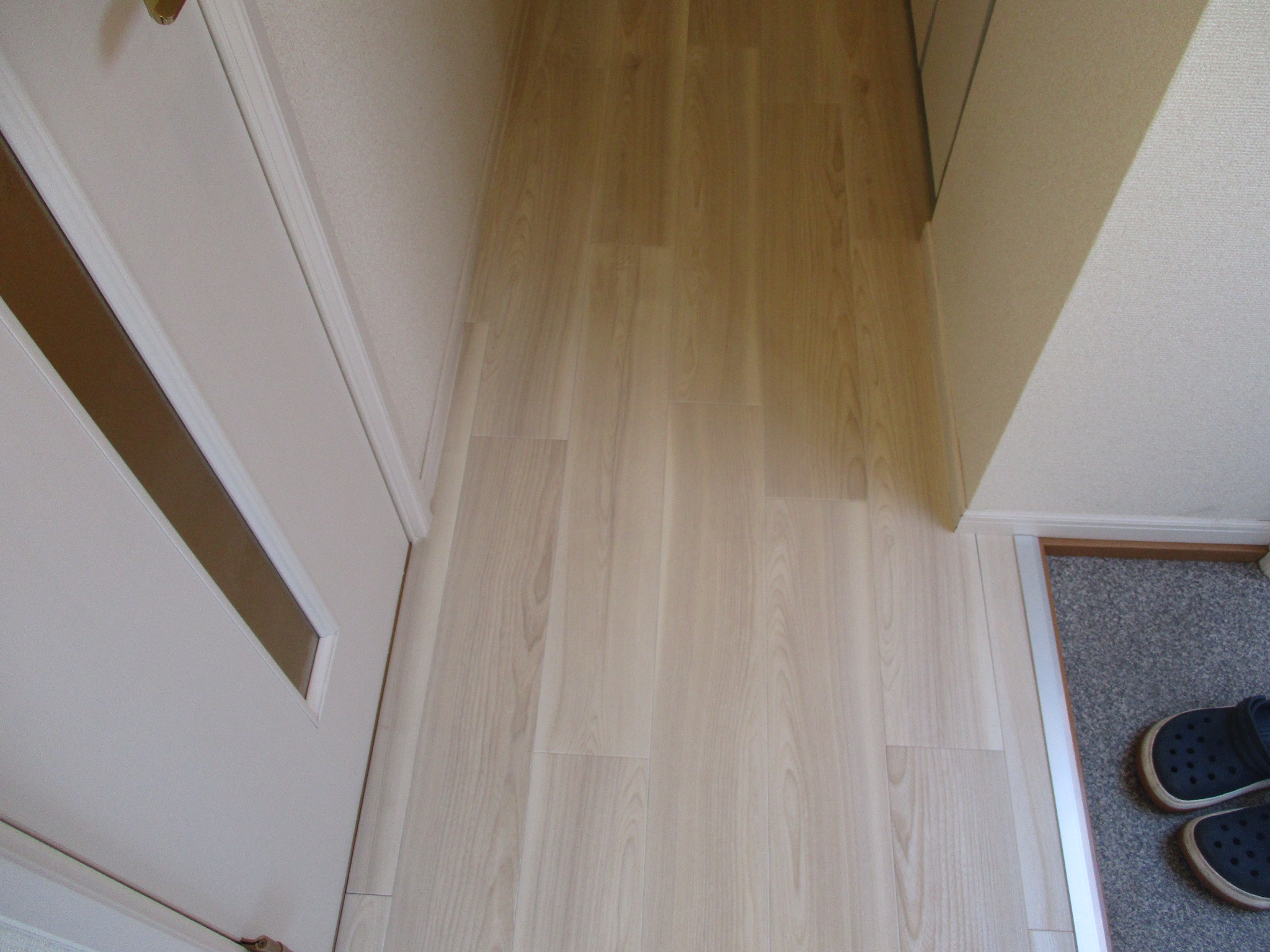 施工後、白系の木目調フロアタイルで広がる清潔な空間