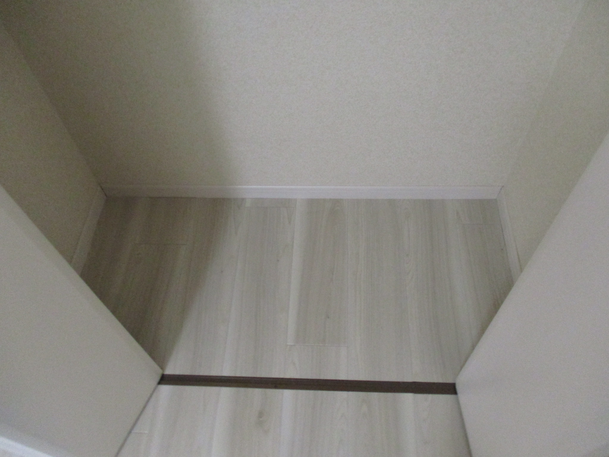 古いフローリングの面影は完全に消え去り、新築のように清潔感あふれる空間が完成いたしました。今回採用したのは、お部屋の建具の色合いに合わせた白系の木目調フロアタイルです。床全体を明るい色調で統一したことで、窓からの光が柔らかく反射し、お部屋全体が実際の面積以上に広々と感じられる素晴らしい視覚効果を生み出しています。本物の木目と見間違えるほどのリアルな質感があり、賃貸物件としてのグレードが格段にアップいたしました。