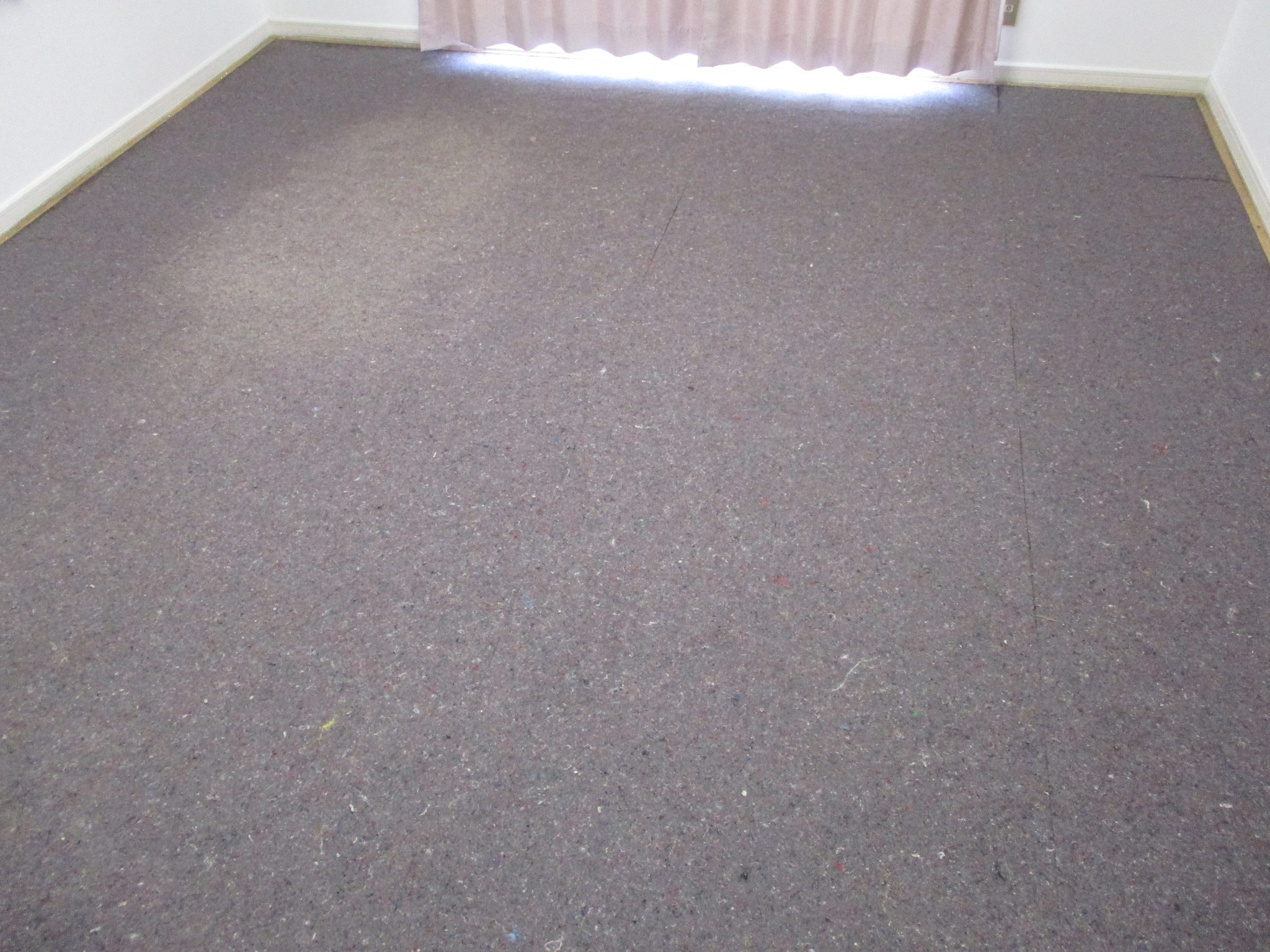一見するときれいに見えますが、表面の繊維には細かな汚れが蓄積し、全体的にくすんだ印象となっていました。古いカーペットを剥がしていくと、その下にはもう一層、別の素材が敷かれているのがわかります。