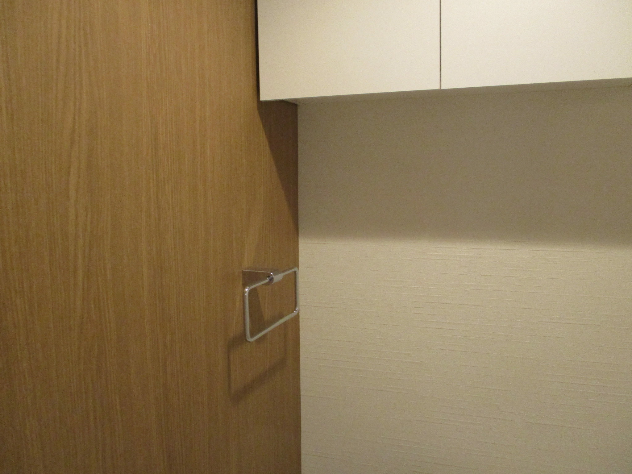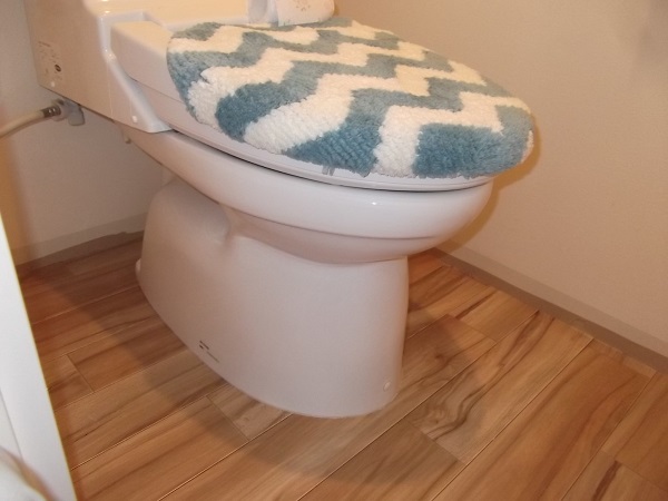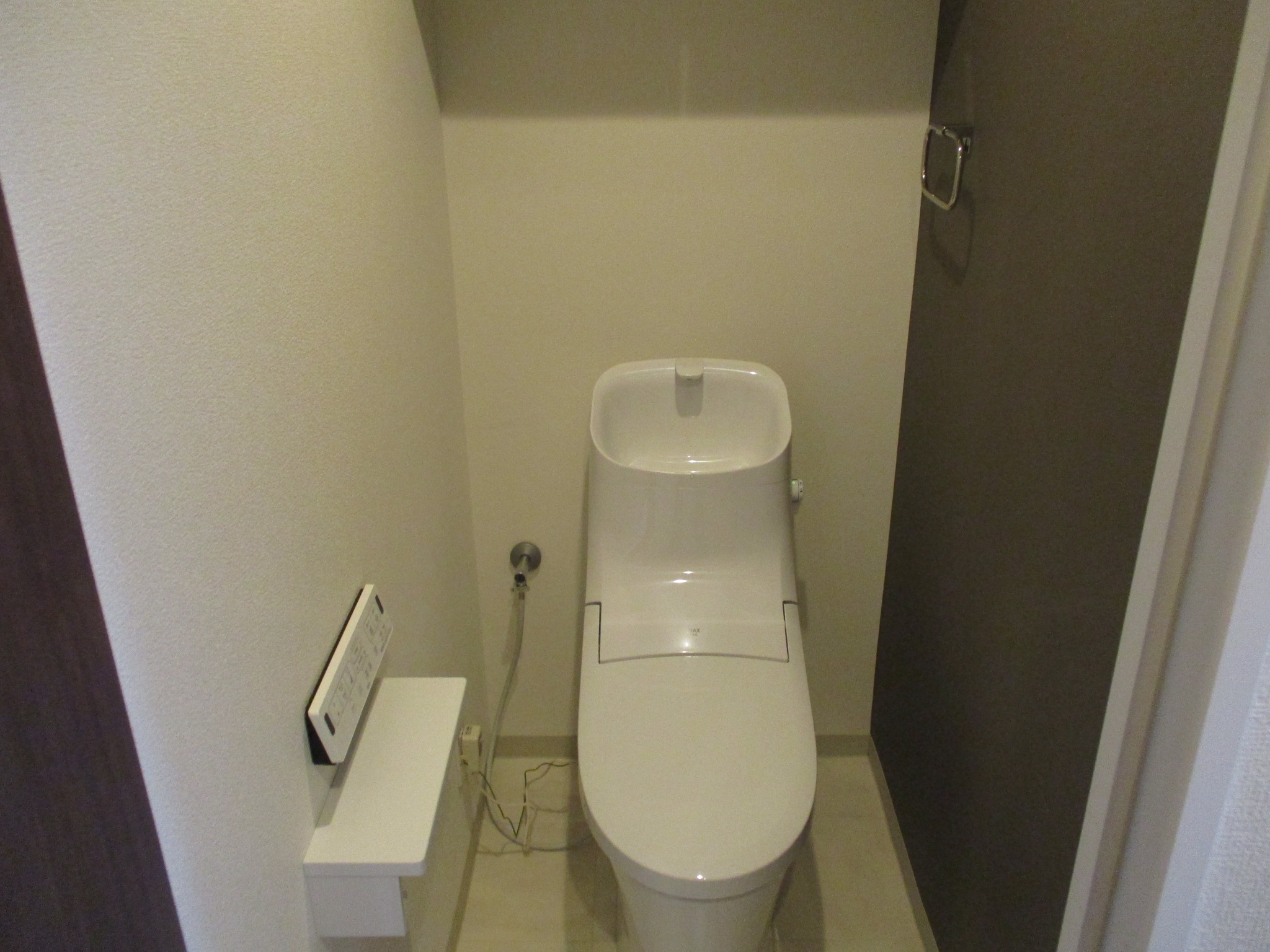 トイレの内装は、基本的には洗面室と同じサンゲツのクッションフロアとクロスを使用して空間の連続性を持たせていますが、デザインに一つの工夫を加えています。それは、便器の背面にあたる奥の壁一面だけに、ブラウン系のアクセントクロスを採用したことです。全面を真っ白にするのではなく、一面だけトーンを落とした落ち着いた色合いの壁紙を貼ることで、狭いトイレ空間に奥行きと立体感が生まれ、ホッと心が安らぐようなリラックスできる上質な空間を演出することができます。サンゲツの豊富なラインナップから選び抜かれた、プロならではのハイセンスなコーディネートです。