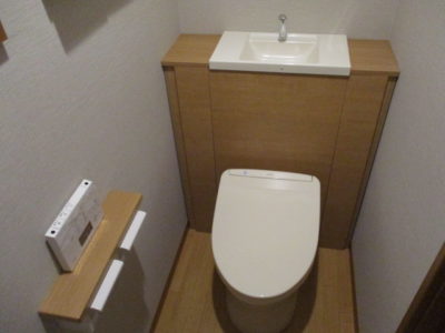 施工後:アクセントクロスで落ち着きを演出したトイレ空間
