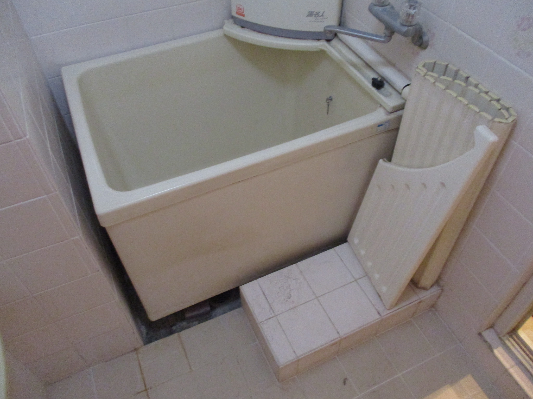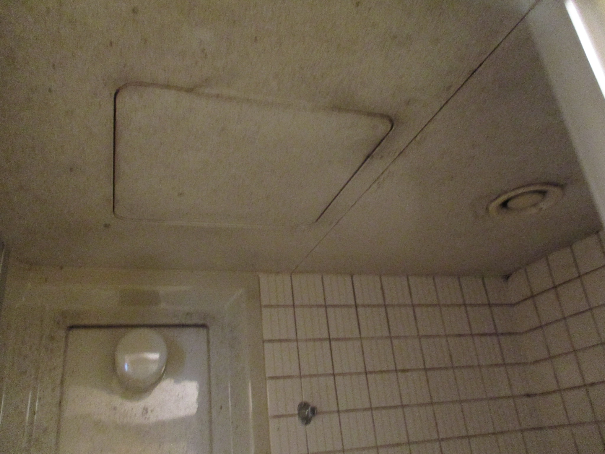 さらに、こちらのお風呂には設備としての大きな機能不足という問題も抱えていました。給湯器に追い焚き機能がついておらず、お湯が冷めてしまった場合は熱いお湯を足して温度を調整するしか方法がありませんでした。また、天井には換気扇のみが設置されており、現代の生活に欠かせない浴室乾燥機の機能も備わっていませんでした。冬場は脱衣所との激しい温度差によるヒートショックの危険があり、梅雨の時期には洗濯物を干す場所にも困るという、使い勝手の面で多くの不満を残す浴室空間となっていました。