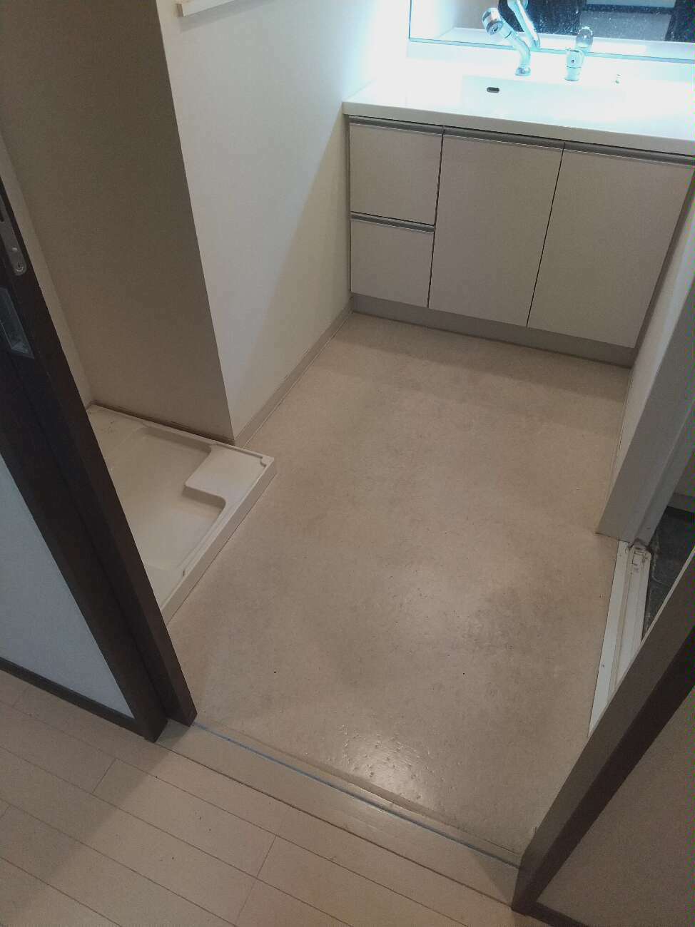 まずは、今回床のリフォームをご依頼いただいたマンションの、施工前の洗面室とトイレの様子を見てみましょう。こちらの物件は築17年という年月が経過しており、前のご入居者様が退去された直後のタイミングで工事のご依頼をいただきました。