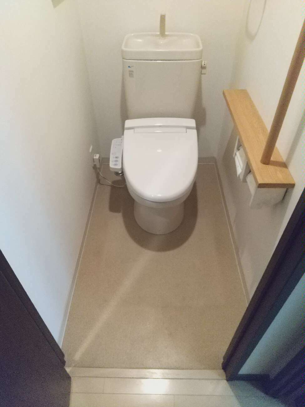 上貼りプランによって、スピーディーかつ完璧に新しい床面へと生まれ変わった洗面室とトイレの様子をご覧ください。