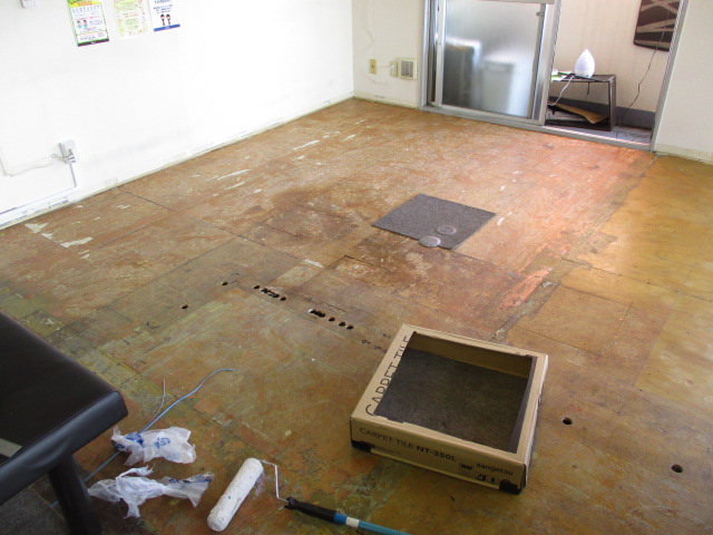 一見するとまだ使えそうなカーペットに見えますが、近づいてよく確認してみると、店舗ということもあり人の出入りが激しい動線部分を中心に、カーペットの生地が薄く擦り切れてしまっている箇所が散見されました。また、タイルカーペット同士の継ぎ目や壁際の部分で接着剤の劣化が進み、シートが床から浮き上がって剥がれている部分も確認できました。