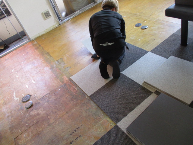 床に塗ったのりが適度に乾燥し、最適な粘着力を発揮する状態になったことを確認してから、いよいよ新しいタイルカーペットを一枚一枚丁寧に貼り付けていきます。