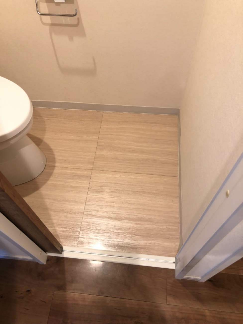 古い壁紙を丁寧に剥がし、新しいブラウンのクロスへと張り替えが完了いたしました。見違えるように洗練されたトイレの様子をご覧ください。