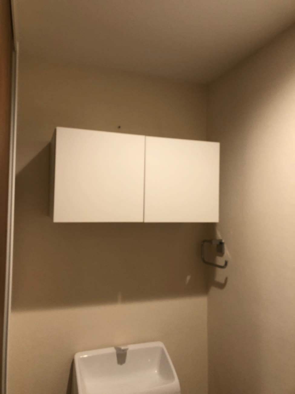 お客様も、この実用的で無難な雰囲気を一新し、もっと落ち着きのあるお洒落な空間にしたいというご希望をお持ちでした。そこで私たちは、トイレに入った瞬間に視線を引きつけるポイントを作るため、壁の一面だけを濃い色に変更するプランをご提案いたしました。