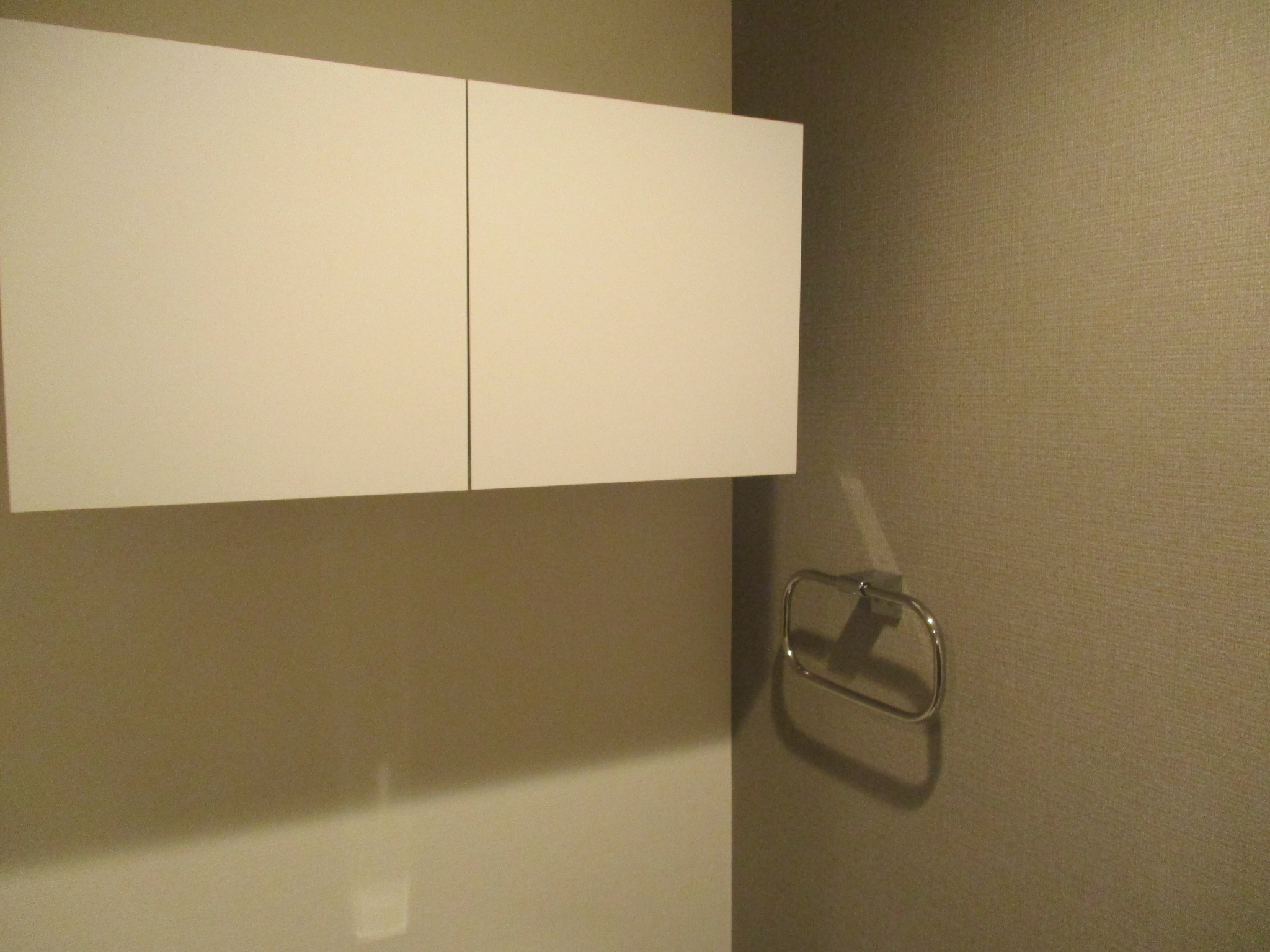 照明の当たり具合で少し陰影がついて見えますが、元々は天井から四方の壁全体に至るまで、すべて同じホワイト系のクロスで統一されていました。便器やペーパーホルダーなどの設備も白や明るい色でまとめられており、とても綺麗にお使いいただいている清潔感あふれるトイレです。