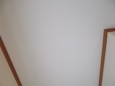 綺麗にお使いいただいているトイレですが、天井から四方の壁全体に至るまで、すべて同じ柄のクロス(壁紙)で統一されています。このクロスには細かなパターン(模様)が入っており、水はねや手垢などの日常的な汚れを視覚的に目立たなくするという、非常に実用的な目的を持った壁紙が選ばれています。