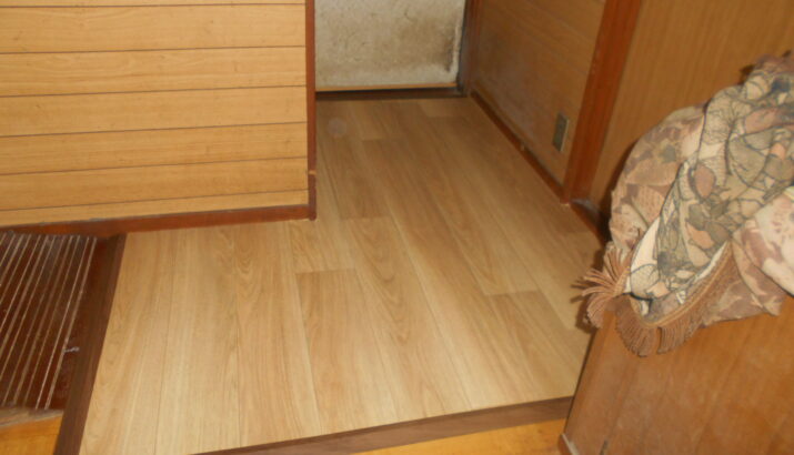 さて、今回のリフォームの最重要ポイントである、段差の解消について解説します。写真の手前部分、新しく張った床と、既存の廊下の境目をご覧ください。ここには、専用のスロープ見切り材を設置しています。