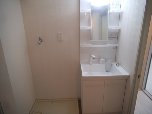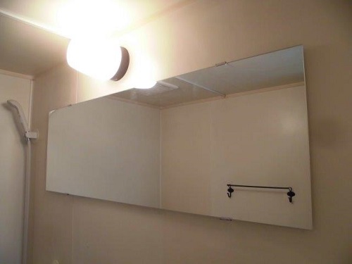 洗面台の機能復旧と位置調整を終えた後、仕上げに大型のミラーキャビネットを設置し、壁紙を全面にわたって張り替えました。新しく生まれ変わったアフター写真をご覧ください。