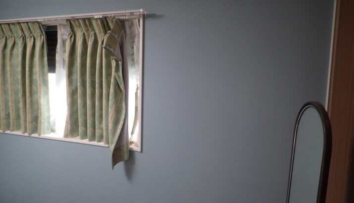 【町田市】白い壁の物足りなさを解消!カーテンと調和するブルーグレー(サンゲツRE55132)で作る、洗練されたアクセントクロス張り替えリフォーム