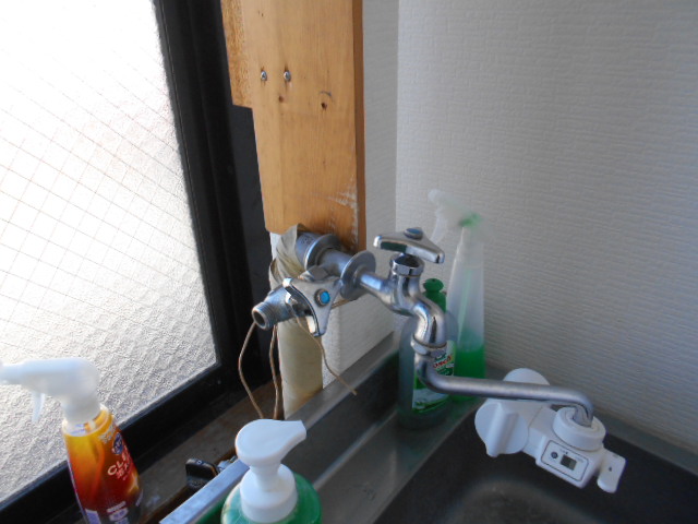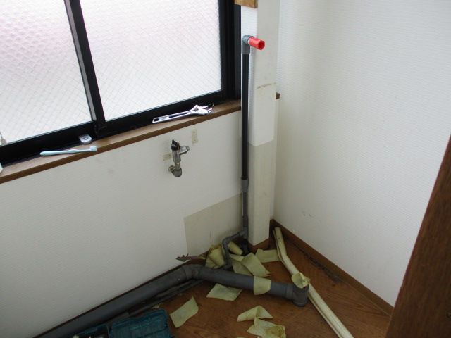 給水管を固定するため保温チューブとテープを剥がし、水栓も外しました。