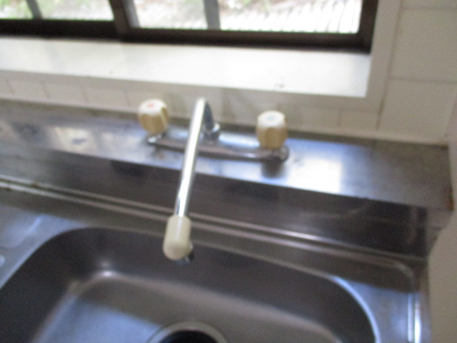 施工前のキッチンの水栓金具です。長年の使用により表面のメッキにくすみが目立ち、レバーの動きにも引っ掛かりを感じる状態でした。根元のパッキン劣化により、微細な水漏れも発生していました。