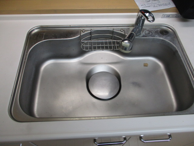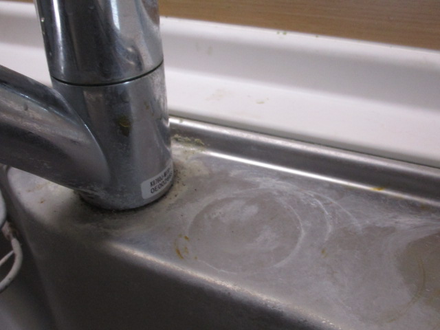 キッチンのシンクです。全体的にくすんでおり、光沢が失われ、水垢が層になって付着しています。