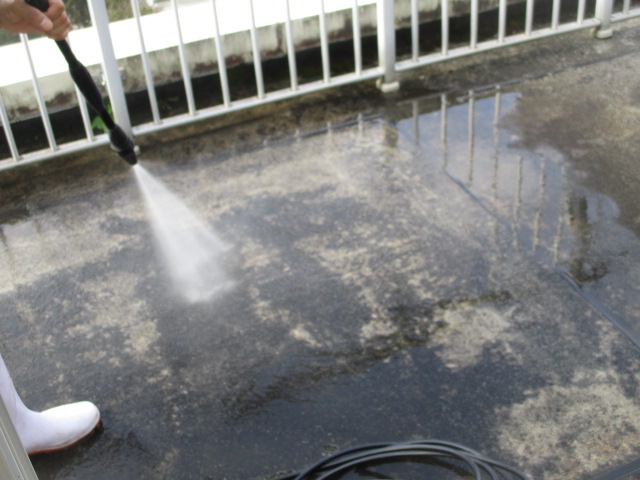 コンクリートの表面が薄くはがれて傷んでいるところに苔が発生して黒くなり、全体的に汚れているように見えます。さらに、柵の外側や排水溝の隅には、所々に雑草も生えていました。これらは放置すると景観を損ねるだけでなく、コンクリートの劣化をさらに進行させてしまいます。そこで、今回はお客様のご要望により高圧洗浄機を使用いたしました。しかし、マンション、つまり集合住宅の場合は、お隣や下階にも特に気を付けて、水しぶきが飛ばないように養生を徹底し、水圧調整等を慎重に行う必要があります。