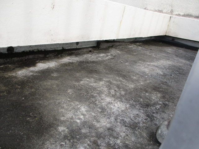 バルコニーのコンクリート部分です。表面が剥がれ、湿気による苔が発生して黒く汚れて見えます。