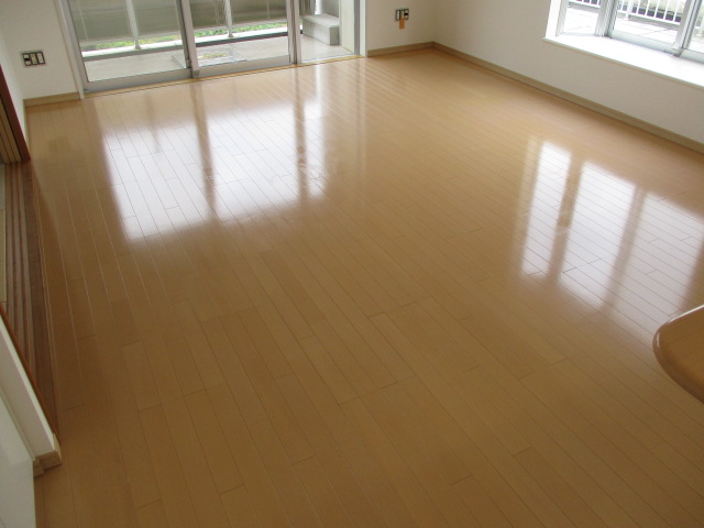 剥離作業を終えて完全に綺麗な状態になったフローリングの上に、真新しいワックスを均一に塗布いたしました。美しいツヤと輝きを取り戻しただけでなく、この新しいワックスの層が、汚れやキズが付きやすいフローリングの表面を長期間にわたってしっかりとガードしてくれます。