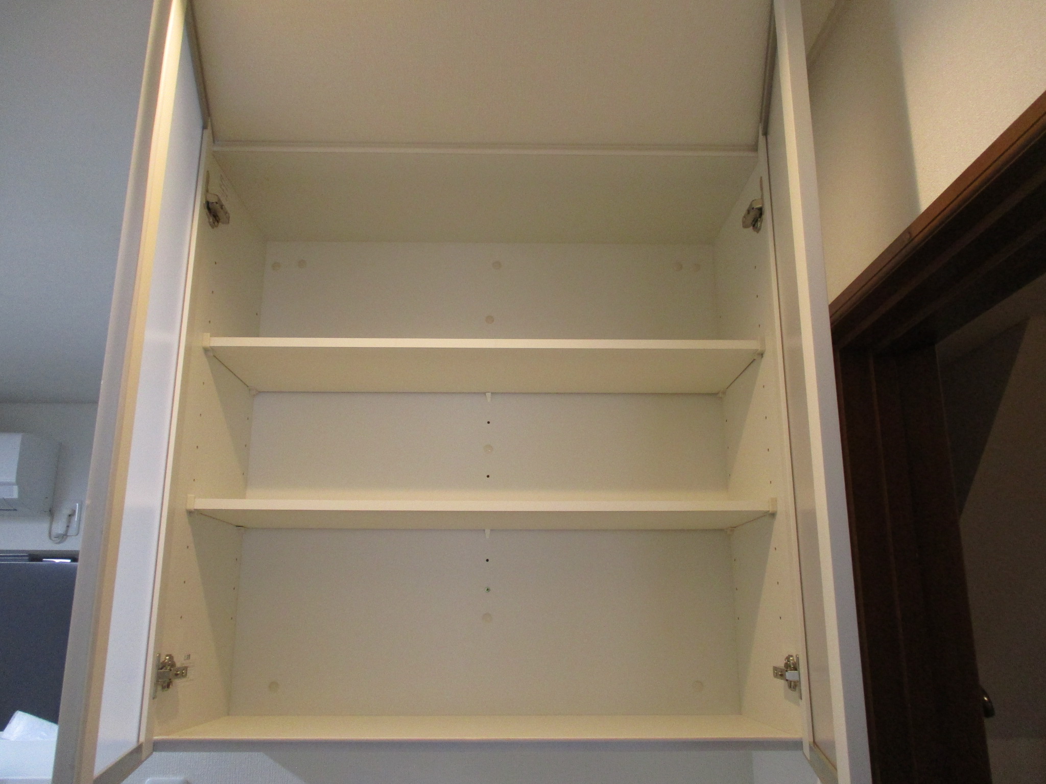 扉を開けた内部の様子です。天井から設置しているため高さが十分に確保されており、日用品などをたっぷりと収納することができます。空間を無駄なく使えるようになり、お部屋全体をすっきりと片付けることが可能になりました。