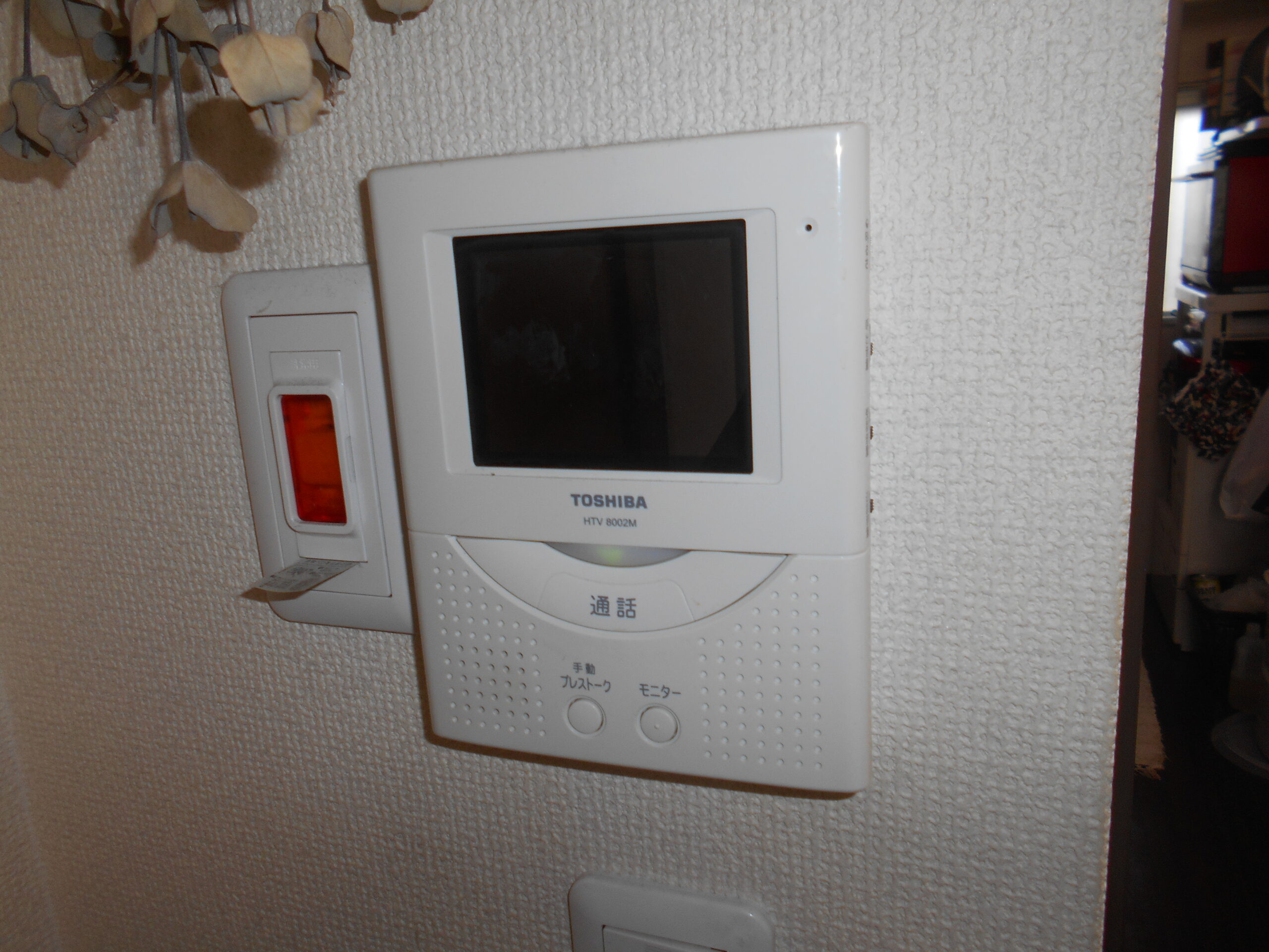 既存の子機には、懐かしい東芝のメーカー名が記載されていました。古い子機を壁から丁寧に取り外し、裏側に繋がっている通信用の配線と電源の配線を新しい機器に合わせて繋ぎ直していきます。