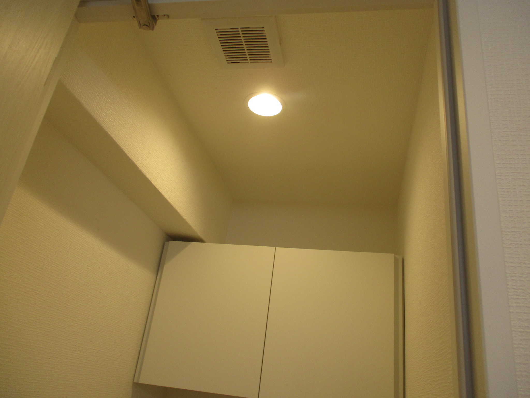洗面室の施工事例、洗濯機上の空中を活かしたランドリー棚