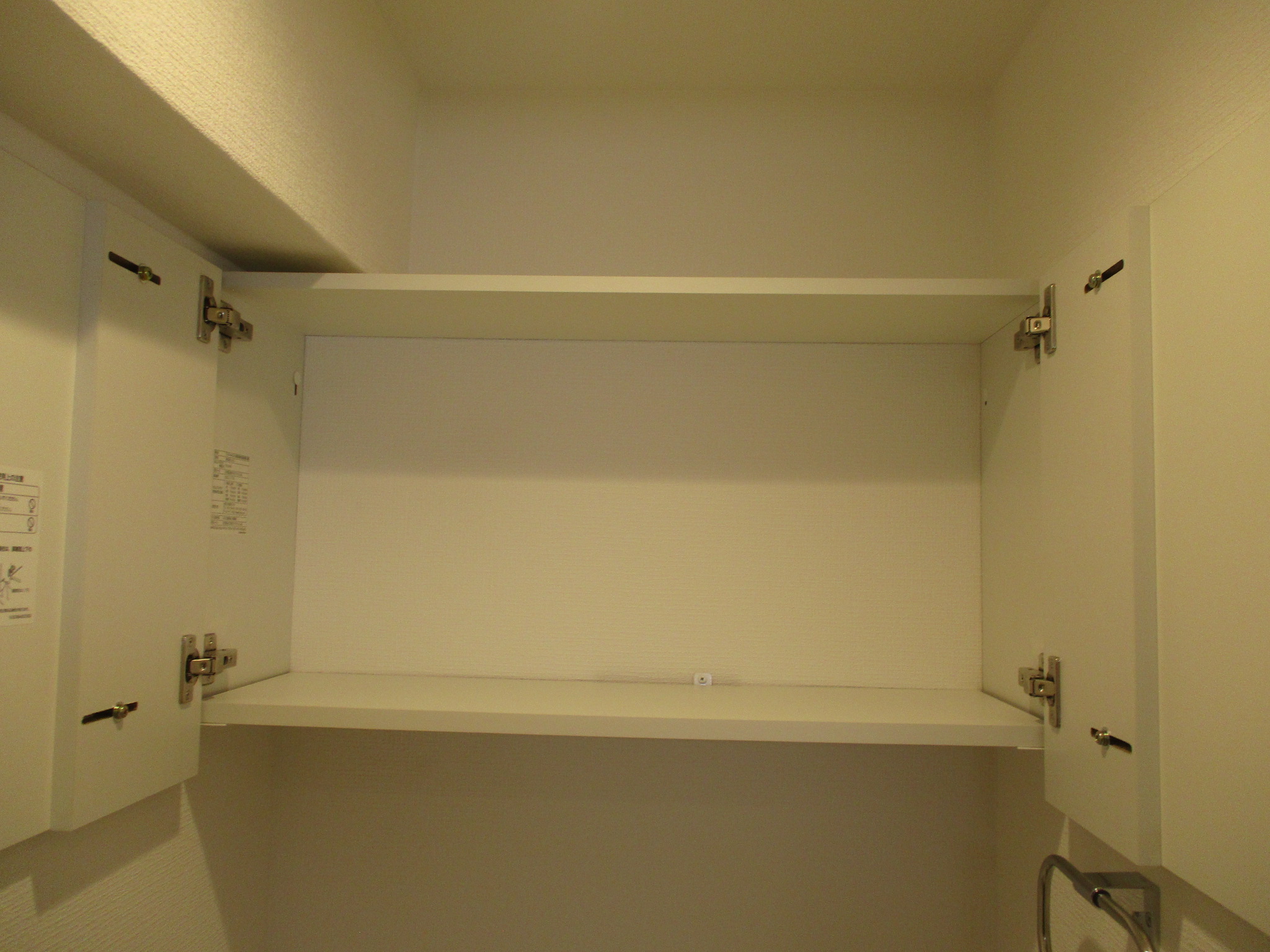 こちらはアッパーキャビネットの扉を開けた内部の様子です。あえて内部に細かな仕切り板や棚板を設けていない構造のキャビネットを採用しています。