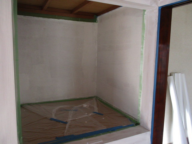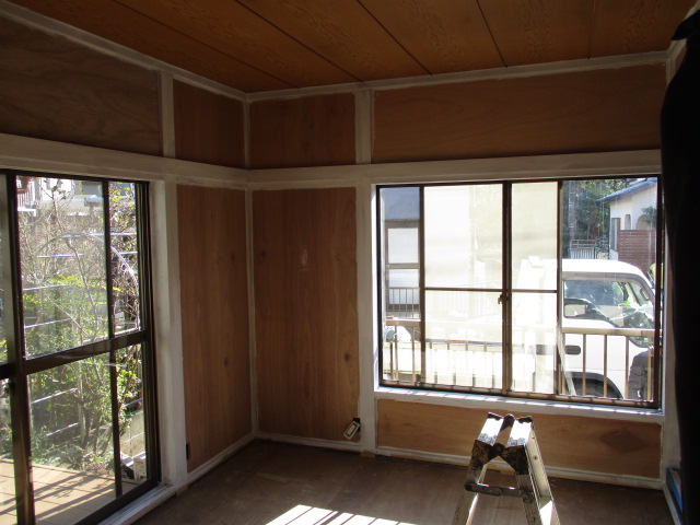 和室を洋風にするための最大の難関は壁の処理です。伝統的な砂壁は、そのままではクロスを貼ることができません。表面を削り落としてパテで固める方法もありますが、今回はより確実な強度と断熱性を確保するために、壁はベニヤを貼り、柱等は塗装の下地を致しました。厚さ数ミリメートルのベニヤ板を砂壁の上から精密に固定していくことで、クロスを貼るための平滑で頑丈な下地が完成いたします。