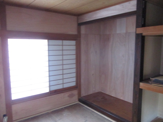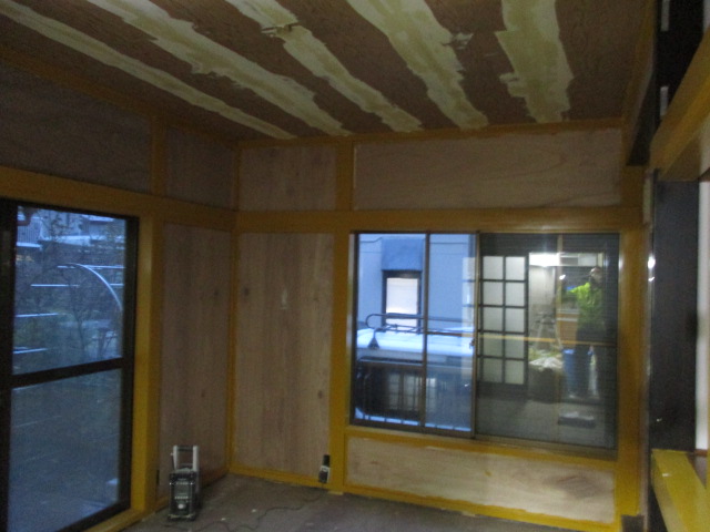壁面にベニヤを貼り巡らせた状態です。これにより、砂壁のポロポロとした剥がれを完全に抑え込むことができます。